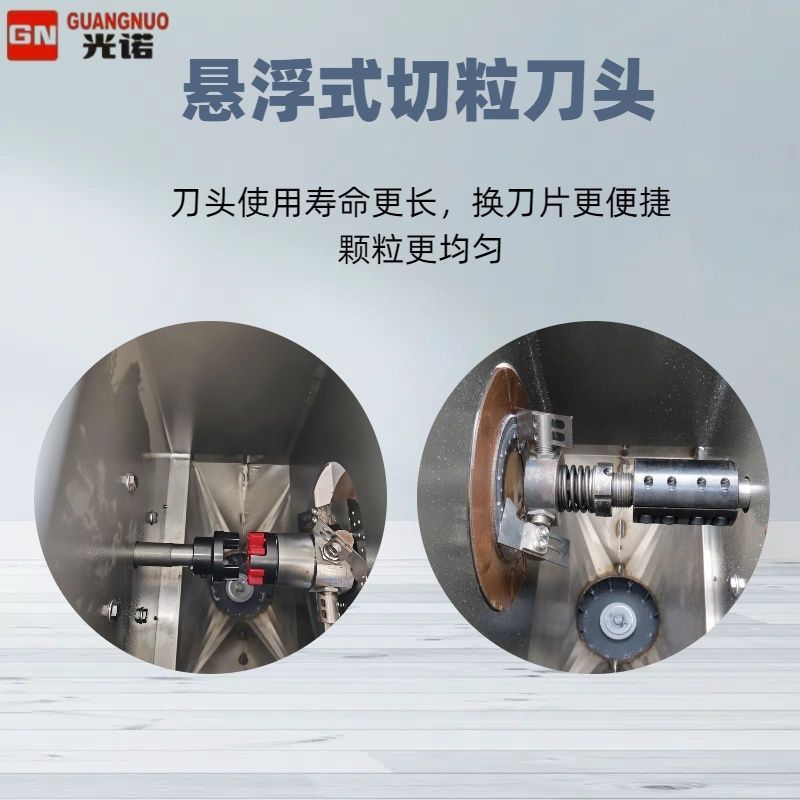 • GN75:環(huán)保造粒機(jī) 適合高壓LDPE、低壓HDPE、可降解塑料、PVC、CPE、TPU,開(kāi)放式風(fēng)罩,觀察顆粒更直觀對(duì)刀頭操作更方便。高溫料噴霧,對(duì)產(chǎn)出的顆粒一定的降溫使顆粒產(chǎn)出更加穩(wěn)定,懸浮式切粒刀頭,刀頭使用壽命更長(zhǎng)換刀片更便捷顆粒更均勻。