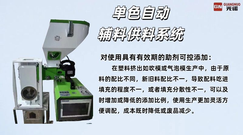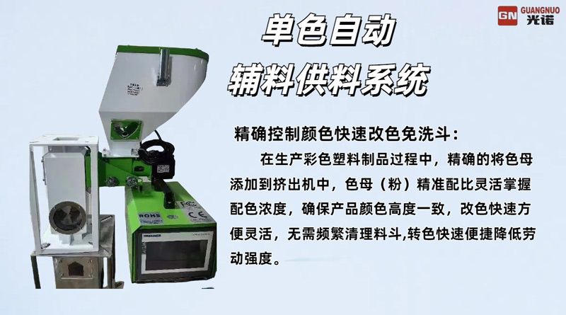 • GN系列自動(dòng)輔料供料系統(tǒng) 分散均勻地添加塑料填充輔料,單色自動(dòng)輔料供料系統(tǒng),降低成本,減少?gòu)U品,使生產(chǎn)配料及改單更加靈活便捷,可靈活調(diào)整填充比例,對(duì)使用具有有效期的助劑可控添加,精確控制顏色快速改色免洗斗。確保產(chǎn)品顏色高度一致,改色快速方便靈活,無(wú)需頻繁清理料斗,轉(zhuǎn)色快速便捷降低勞動(dòng)強(qiáng)度。