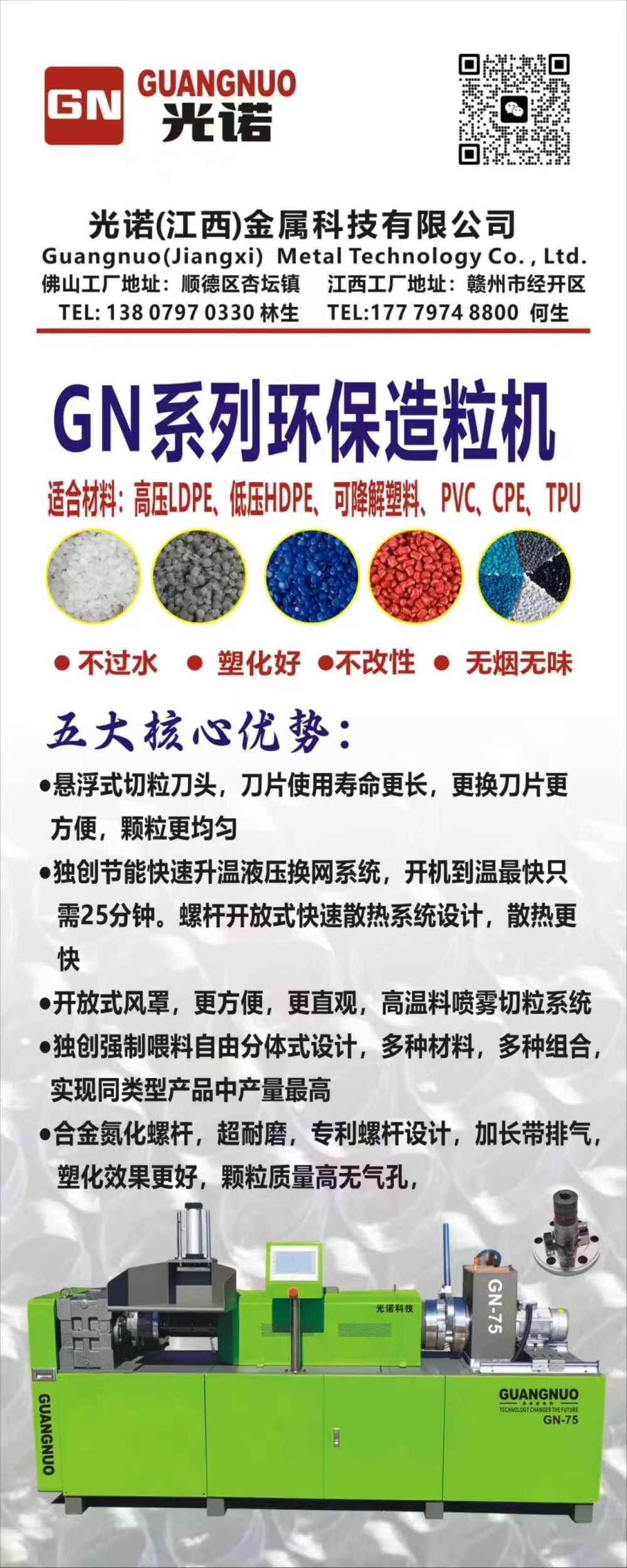 您好,歡迎來(lái)到光諾(江西)金屬科技有限公司,主營(yíng)塑料環(huán)保造粒機(jī)、氣泡膜工藝技術(shù)等機(jī)械設(shè)備